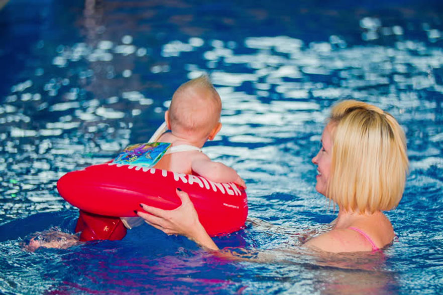 - Swimtrainer o flotador de entrenamiento. Diseñados según el fabricante para ofrecer una postura óptima para la práctica de la natación. Un poco aparatoso pero la verdad es que tiene un buen cierre de seguridad que no está al alcance del peque, es buen elemento de flotación, ofrece practicidad a la hora de realizar juegos en el agua y tienen varios modelos en función del peso, lo cual permite una evolución. Se puede usar desde bebés. Os recomiendo este flotador pero también tenerlos en brazos cuando son muy peques, piel con piel también en la piscina. Eso les ofrece la seguridad de los brazos, el calor.
