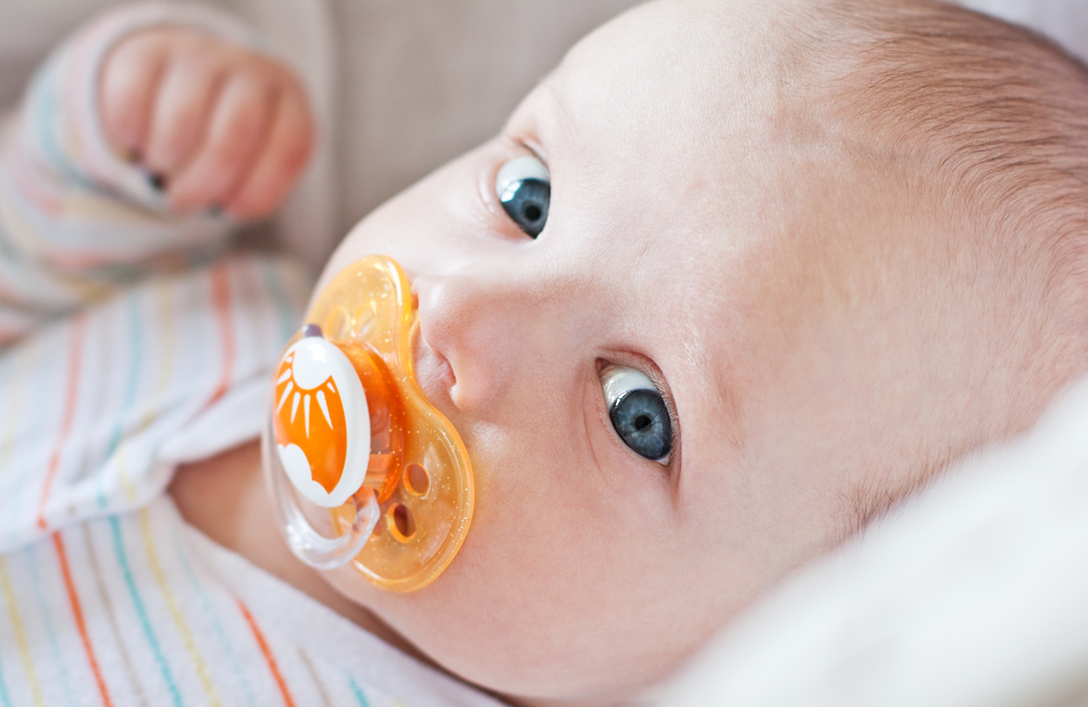 - Der Schnuller, den er trägt, ist ein Soothie aus latexfreiem Silikon in medizinischer Qualität.